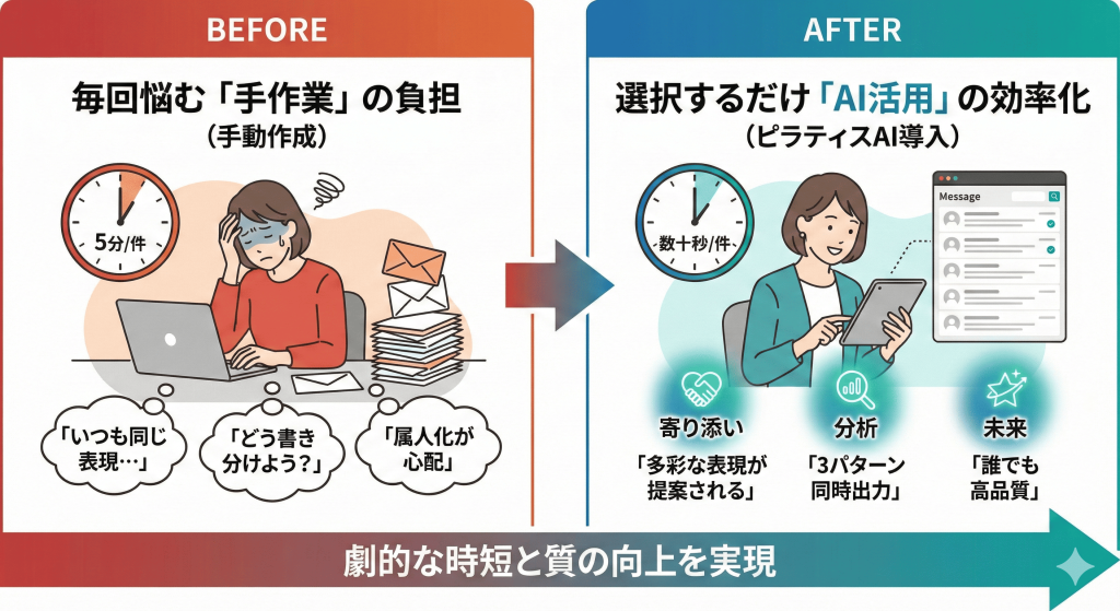 従来は1件あたり5分程度悩みながら作成していたメッセージが、選択肢を選ぶだけの数十秒に短縮。「何を書こうか」と画面の前で止まる時間がゼロになりました。